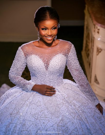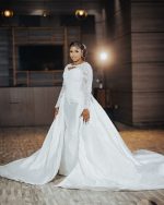 Looking to highlight your curvy silhouette? This beaded lace dress has all the allure and detailing required to create a show stopping look on your big day. Features a detachable skirt measuring 1.5m long.
