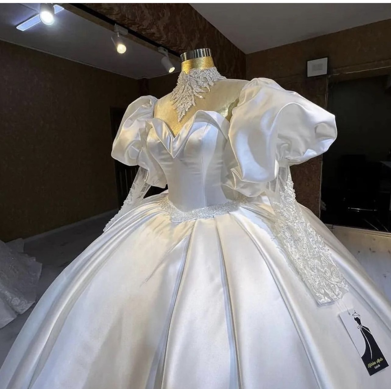 Luxe satin long sleeve A-line vintage dress. This dress is a perfect delight for the modest bride looking for something simple but with details you can’t ignore.